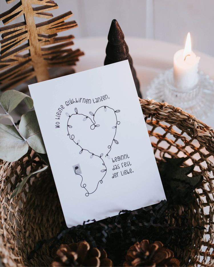 Unsere weihnachtliche Postkarte mit dem stimmungsvollen Spruch "Wo kleine Glühbirnen tanzen, beginnt das Fest der Liebe" fängt die Magie der Weihnachtszeit perfekt ein. Sie ist ideal, um deinen Liebsten herzliche Grüße zu schicken und die Wärme des Festes der Liebe zu teilen.