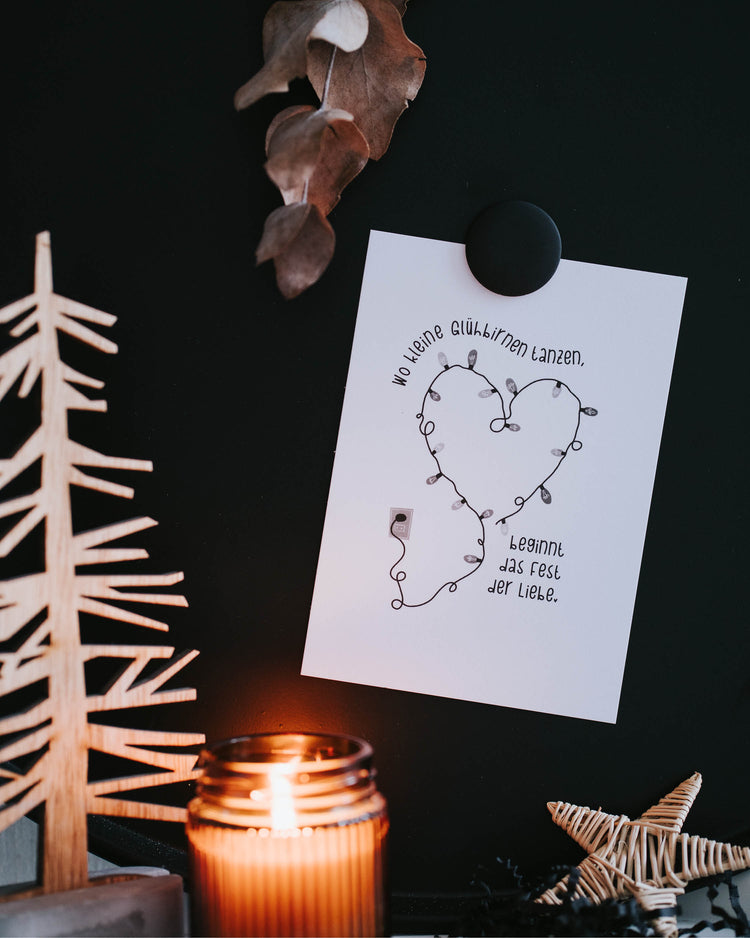 • Aufdruck: "Wo kleine Glühbirnen tanzen, beginnt das Fest der Liebe"