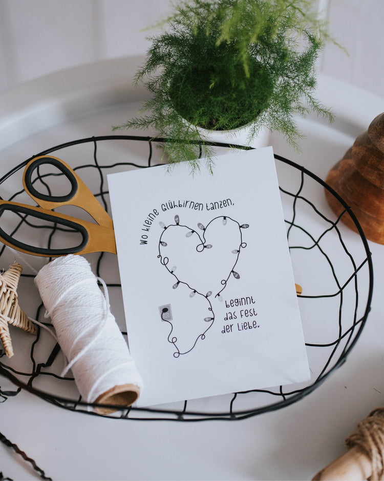 Diese Karte, aus nachhaltigen Materialien und im modernen Design, versprüht weihnachtliche Vorfreude und zaubert jedem ein Lächeln ins Gesicht. Ein festlicher Gruß, der den Zauber von Lichtern und Liebe vermittelt.